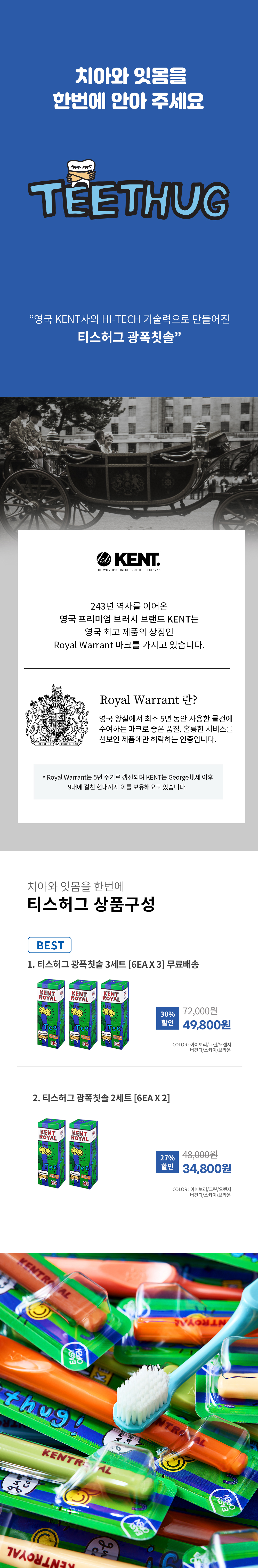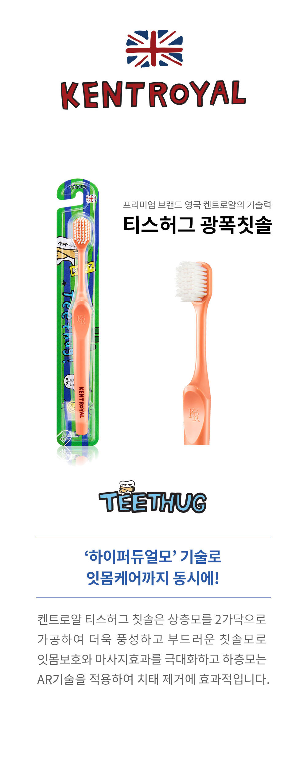 TEETH를 HUG. 티스허그는 넓은 6열의 광폭 칫솔모로 어금니를 감싸안듯 케어합니다. 2갈래로 나누어진 초극세 상층모와 AR 기술로 둥글게 다듬은 하층모가 잇몸 보호와 마사지 효과를 극대합니다. 유명 팝아티스트 켈리박과의 콜라보레이션으로 만들어진 유니크한 디자인으로 화장실의 감성을 밝혀보세요.